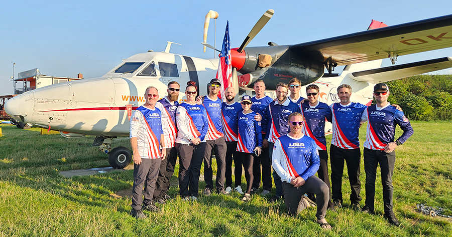 USA 1/SDC Core (Chip Keating, Sam Lendle, Jason Russell, Nicole Senecal and Stephanie Strange) and USA 2/SDMW Chemtrails (Kyle Brady, Matthew Congdon, Colin Conway, Keith George and Nathan Norem) are representing the U.S. in vertical formation skydiving.