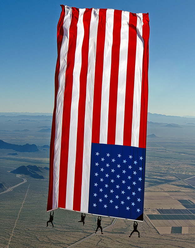 At the 3-minute warning, everyone took their places on the skids and moved the flag into position for exit. Once ground crew gave the go ahead and pilot Shawn Hill gave clear to drop, Steve Curtis gave the count. The entire team stepped off into the almost dead air of a 30-knot helicopter exit. As they dropped into freefall, the flag unfurled smoothly, locking into place at several hinge points along the leading edge. After roughly 20 seconds and 3,500 feet, the fully unfurled flag flew straight. The team was able to internally celebrate the accomplishment for about 1,500 more feet before breaking off at 5,000 feet to track away and deploy.
