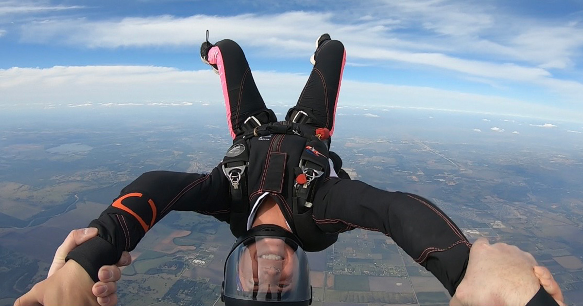 Rayann Otto jumps with fellow 50-state candidate Kaine Wadsley at Skydive Spaceland-Houston in Rosharon, Texas.Photo by Kaine Wadsley.