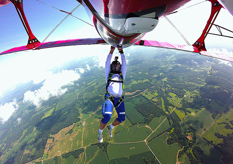 Kevin Trittschuh hangs from an inverted biplane at West Tennessee Skydiving in Whiteville. Photo by Mike Mullins.