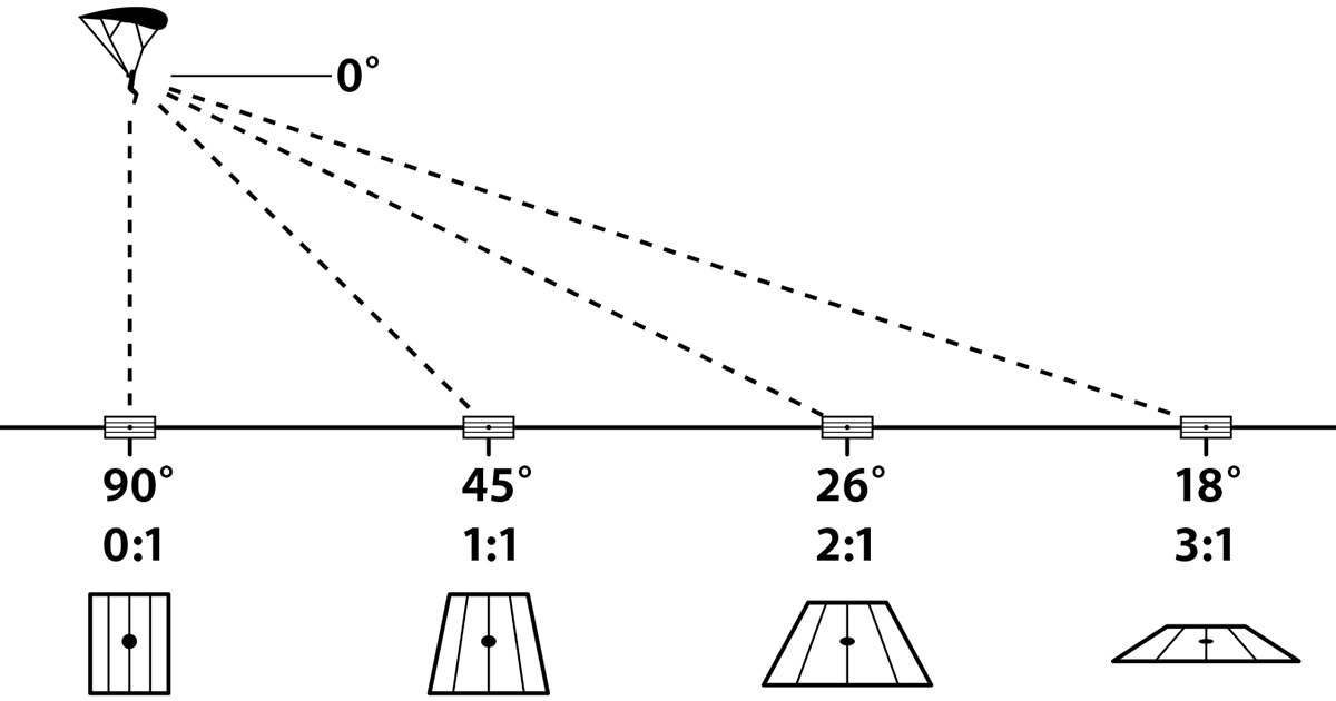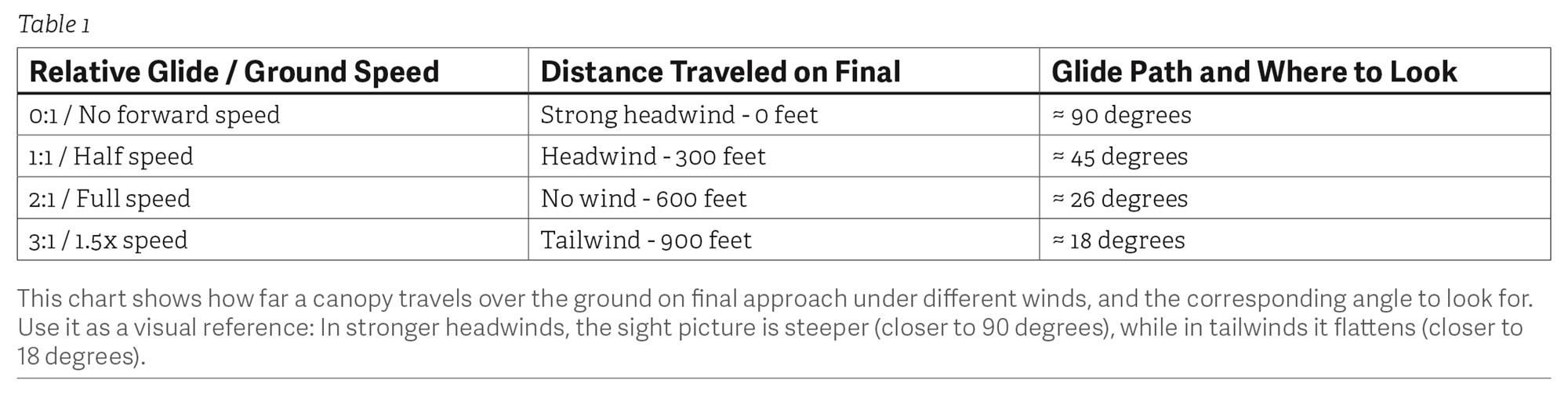 Train yourself to identify these angles by cutting cardboard into triangles at the specified degrees. To find the proper angle to the target, hold a triangle cut to the appropriate dimension of your canopy’s glide angle. Keep the base parallel to the floor and line up the far tip with the first third of a rectangular sheet of paper placed flat on the ground.
