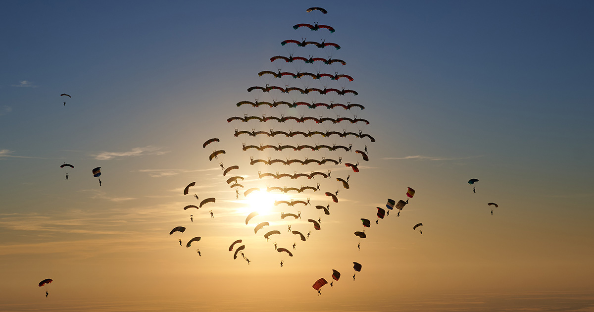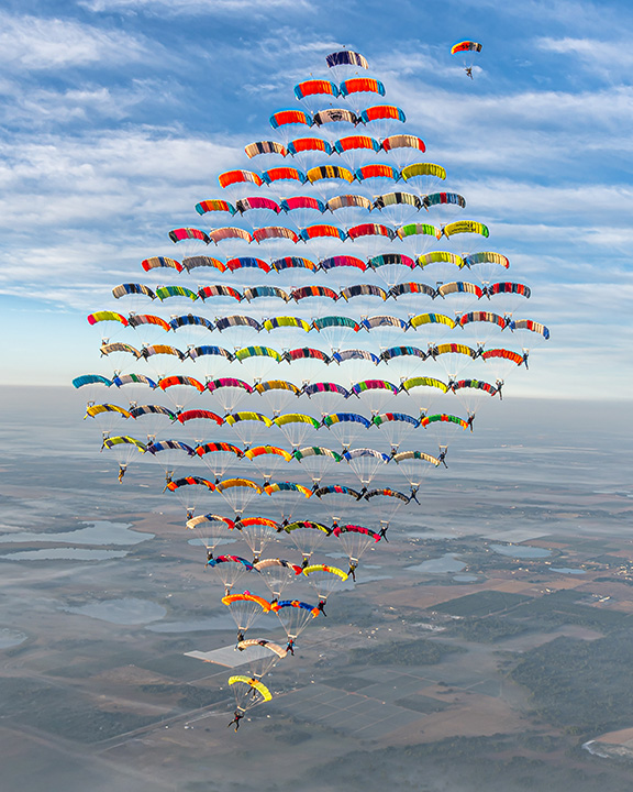 A key element of the project’s success was individuals not only fine-tuning their own performance, but developing a team mentality with their row members and plane groups. Organizers gave specific consideration to the order of row jumpers and the assignments of the row-leader “wings” (the jumpers guiding each incremental group in to dock), as these individuals were expected to not only dock proficiently and fly a competent approach, but also offer guidance and stewardship to those following. The result was several microcosms of trust, structure and performance that bolstered the overall group’s ability to turn 104 individual skydivers into one record-setting team.