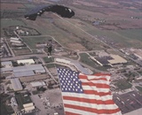 Kevin Butler, a member of the Greater Kansas City Skydivers, trails the American flag into the opening ceremonies of the air race show while cameraman Jamie Paul, D-12641, follows him down. The three-day event drew more than 100,000 people to the airfield.