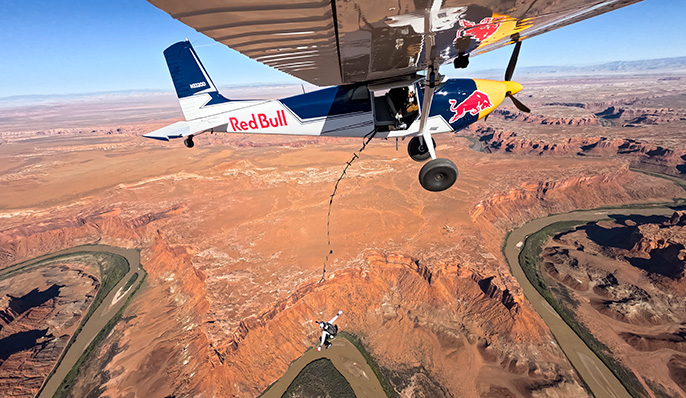 On game day, Aikins flew his hot-rodded Cessna 180 while Chapman raced her 2018 side-by-side off-road vehicle toward the canyon rim. As the edge drew near, Aikins dropped in low, matching Chapman’s speed and lining up perfectly above the vehicle. A ladder extended from the belly of the plane, swaying slightly in the prop wash. Chmelecki steadied herself, timed her movement and climbed from the speeding vehicle onto the ladder. As Aikins began to climb, the aircraft lifted smoothly away from the desert floor, carrying Chmelecki up over the rim and out above the canyon. When they reached 4,000 feet above the rim, she released her grip—freefalling roughly 1,500 feet before opening her parachute and gliding to the canyon’s floor.