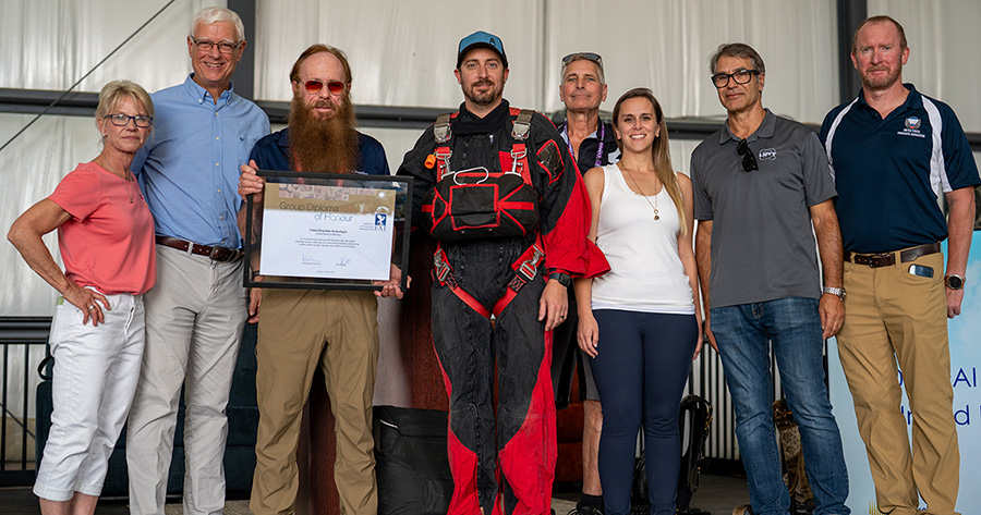 Principato then presented Bill Booth, Mark Procos and other staff of United Parachute Technologies with FAI Group Diploma of Honor, which honors groups of people who “have contributed significantly to the progress of aeronautics and astronautics during the previous year or years.” USPA nominated UPT for the award for being “a driving force in advancing the safety, performance and accessibility of skydiving equipment worldwide.”
