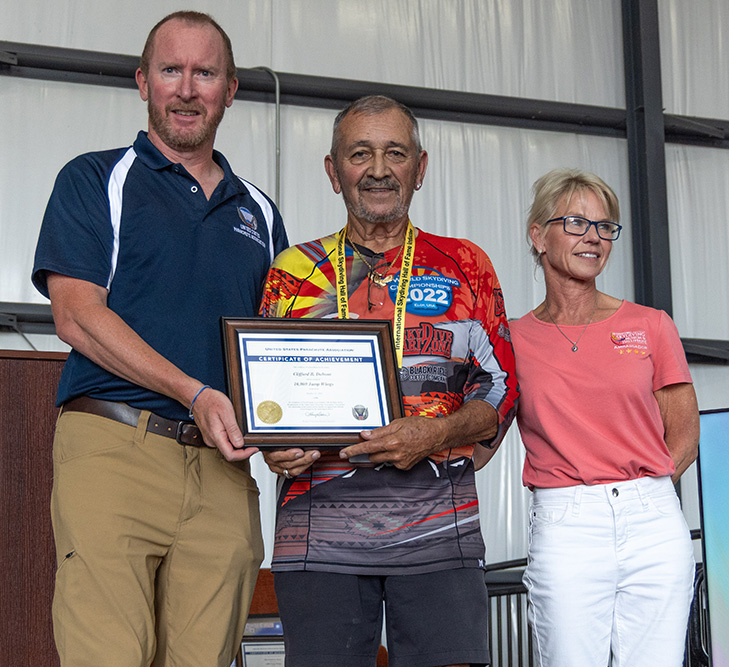 Cliff Dobson accepts his 10,000-Jump Wings from USPA Executive Director Albert Berchtold and President Sherry Butcher. Photo by Javier Ortiz.