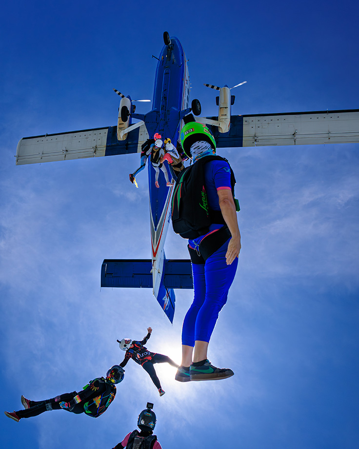 As is typical for Houston, the weekend did succumb to a few periods of high winds and short rainstorms, but even while grounded, the team’s energy never dimmed. They utilized downtime by sharing stories, backgrounds and words of encouragement, turning weather holds into opportunities for deeper connection. The first day of warm-ups was filled with smiles and giggles all around, but the following day, the team focused on the record attempts. From almost 14,000 feet, they successfully completed a two-point 10-way vertical sequential formation on the first jump, and yet, they weren’t satisfied; one more lady needed to join in. Successful completion of multi-point formations requires precise timing, unwavering confidence and quick thinking in freefall. As bodies rotate and grips lock in mid-air, the choreography resembles a delicate dance, one where every move counts and every second matters. Through calculated slotting and grip changes, these women set the Texas Record for Largest Two-Point Head-Down Formation with an 11-way, verified by the on-site judge, Christy West. The determination in the new record holders was steadfast, so they immediately went back up and set another record: a three-point 11-way. The exhilaration was palpable. To celebrate, Chef Jared prepared and served a Mediterranean dinner at the Cutaway Cafe. The group celebrated their accomplishment with visible joy and a strong sense of connection.
